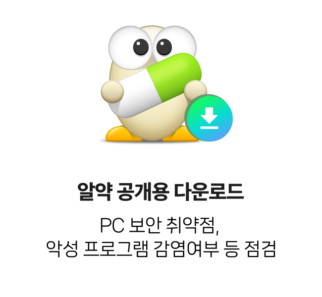 본 서비스는 알약 공개용/알약M 다운로드를 통해서도 보안 점검을 무료로 지원받으실 수 있습니다.