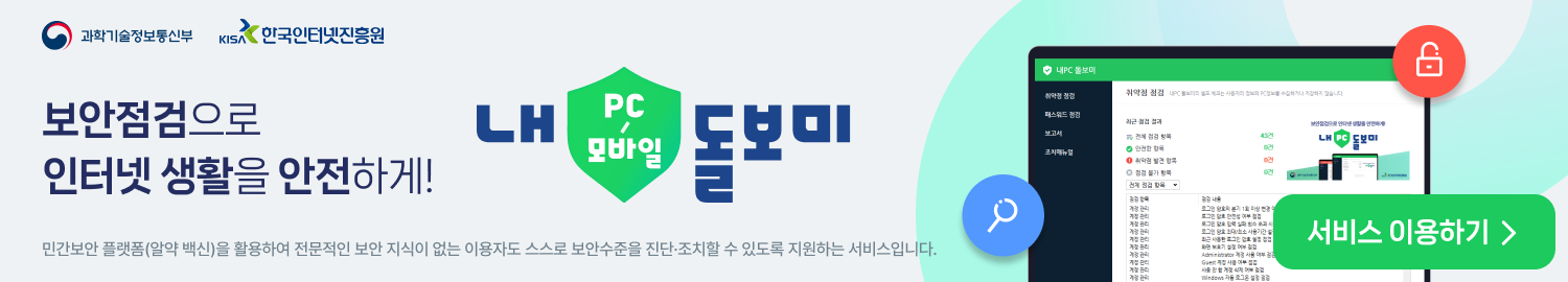내PC·모바일 돌보미 서비스란 과학기술정보통신부가 한국인터넷진흥원과 함께 전국민 대상의 보안 강화를 위해 자동점검 방식을 도입해 국민이 보안수준을 스스로 진단 할 수 있는 보안점검 서비스입니다.
