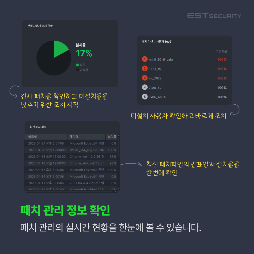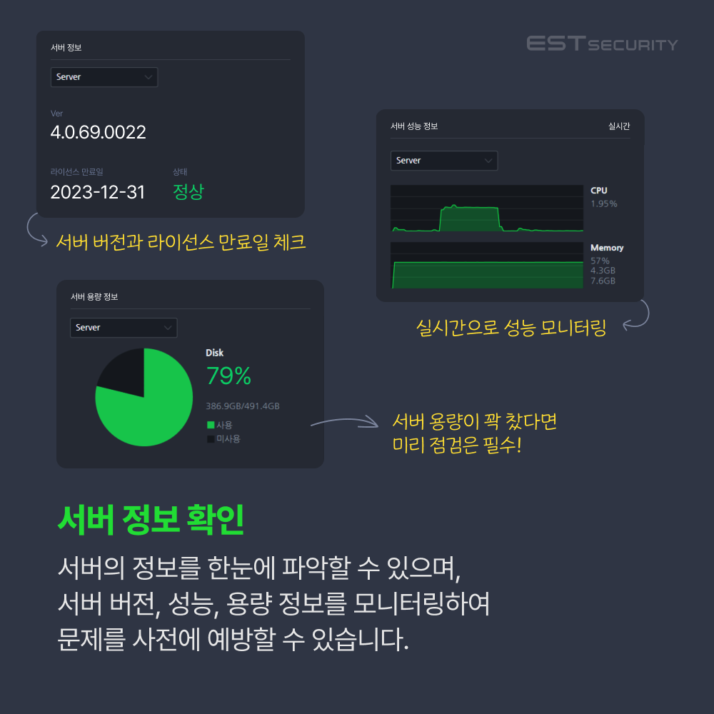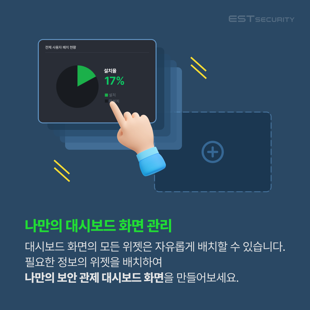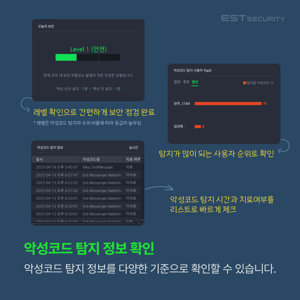 전사 보안 관제 시 가장 중요한 점은 항상 전사 시스템 상황을 한눈에 모니터링 할 수 있어야 한다는 점입니다. 이스트시큐리티의 통합보안 중앙관리 솔루션 ASM(ALYac Security Manager)은 최적화된 디자인의 대시보드 화면을 통해 여러 보안제품의 상태를 한눈에 파악할 수 있도록 도움을 주고 있습니다.