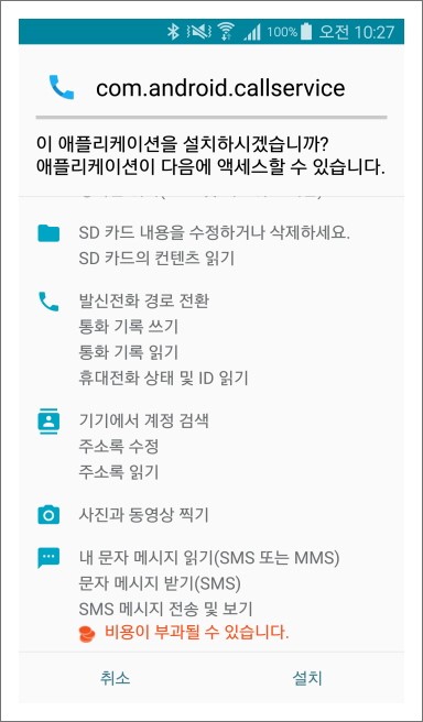 해당 악성 앱은 “Call Service”라는 전화 관련 앱으로 위장하고 있어 피해자는 전화 관련한 부가기능을 가진 앱을 설치하는 것으로 오인하여 설치를 진행하게 됩니다.