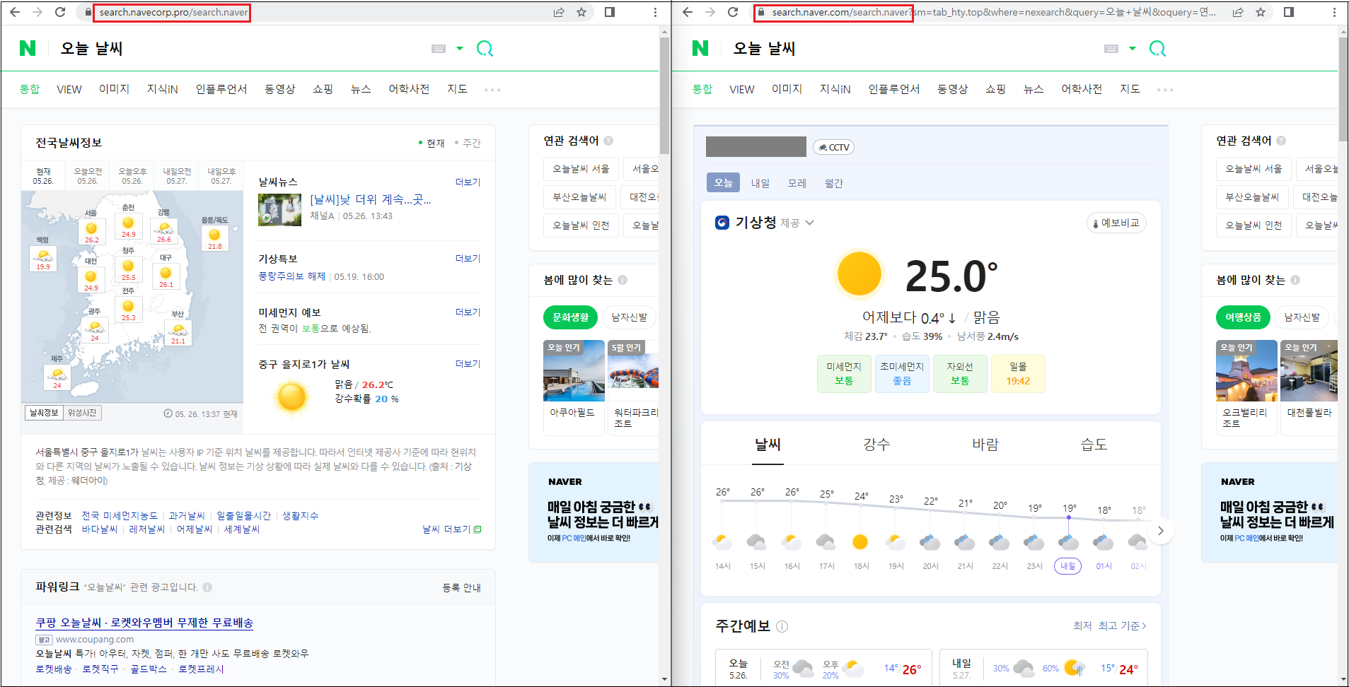 검색 창에서 검색을 하면 결과값도 보여주기 때문에 사용자들은 피싱 페이지라고 인지하기 매우 어렵습니다.