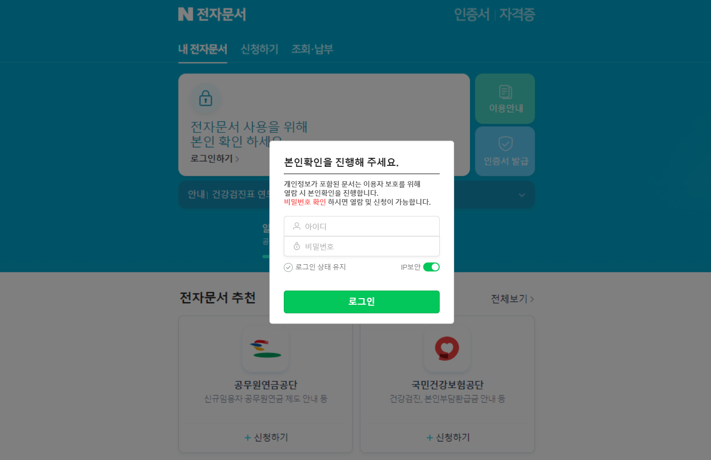 만일 수신자가 피싱메일 하단의 [확인하러 가기]를 클릭하면 네이버 전자문서 피싱 페이지에 접속되며, 아이디와 비밀번호 입력을 유도합니다.