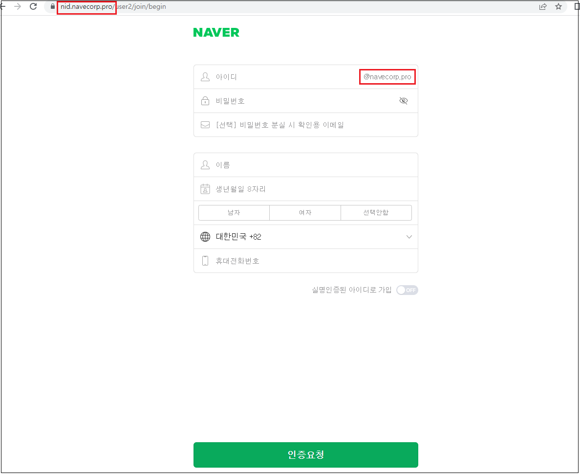 만일 수신자가 피싱메일 하단의 [확인하러 가기]를 클릭하면 네이버 전자문서 피싱 페이지에 접속되며, 아이디와 비밀번호 입력을 유도합니다.