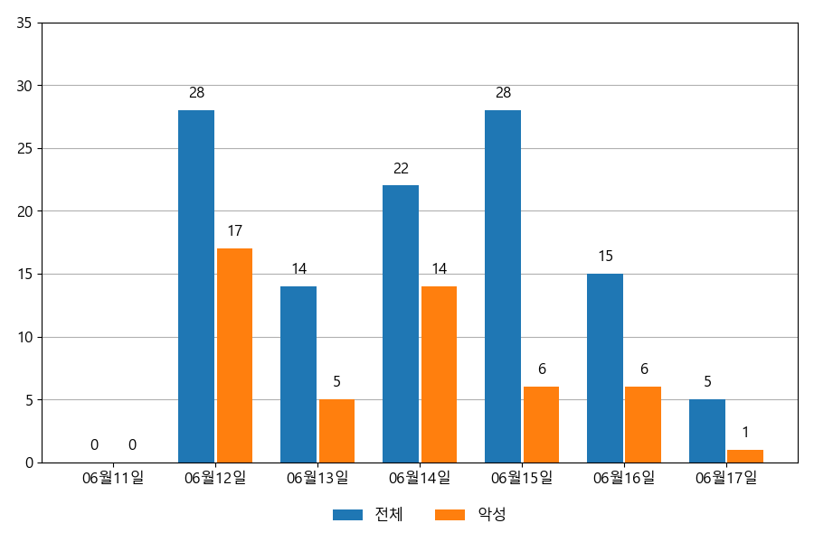 일일 유입량은 하루 최저 5건(악성 1건)에서 최대 28건(악성 17건)으로 일별 편차를 확인할 수 있습니다.