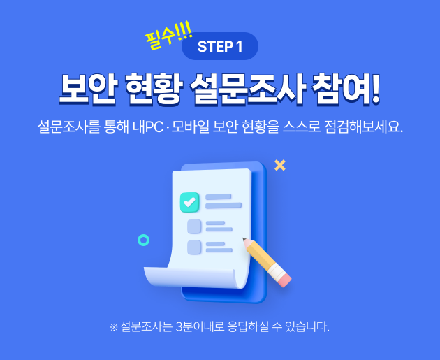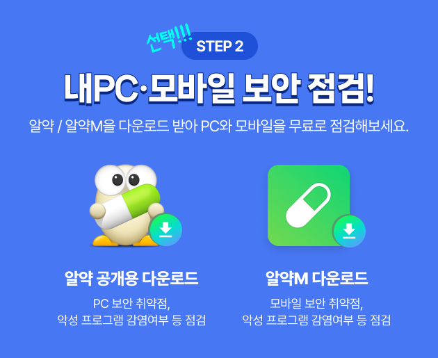 최근 비대면 서비스가 일상화됨에 따라, PC·모바일 기기의 사용이 늘어 사이버 공격 가능성이 높아졌는데요. 여러분의 PC·모바일 보안 환경은 안전한지, 또 잘 관리되고 있는지 간단한 설문을 통해 점검해보시고, 알약/알약M을 다운로드 받아 보안 점검 및 안전조치를 무료로 받아보세요!