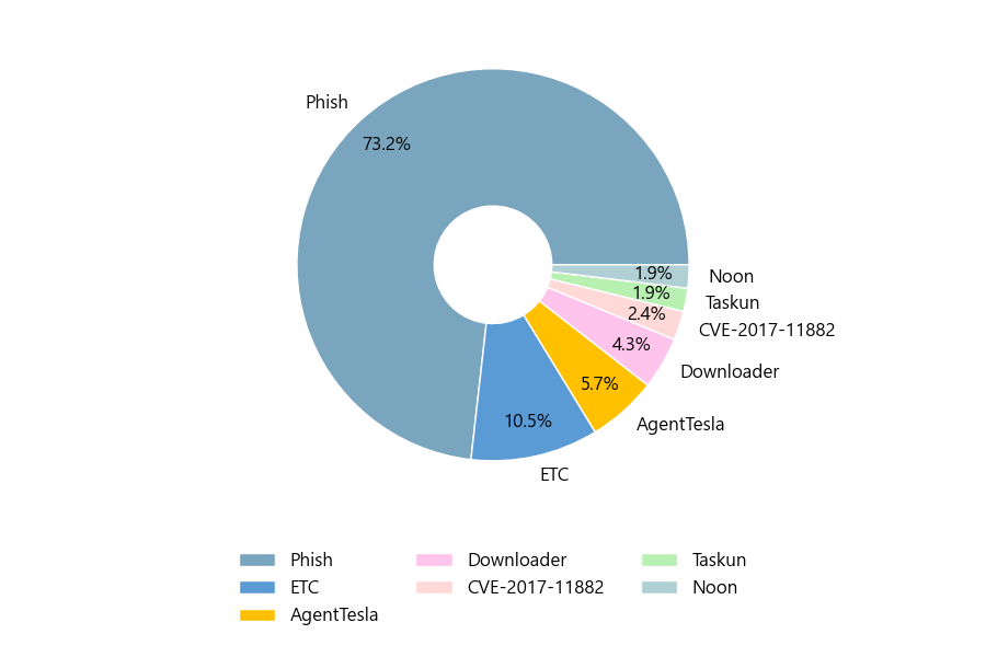 첨부파일은 ‘Phish’형태가 73.2%로 제일 큰 비중을 차지했고 뒤이어 ‘ETC’, ‘AgentTesla’가 각각 10.5%, 5.7%의 비중을 차지했습니다.