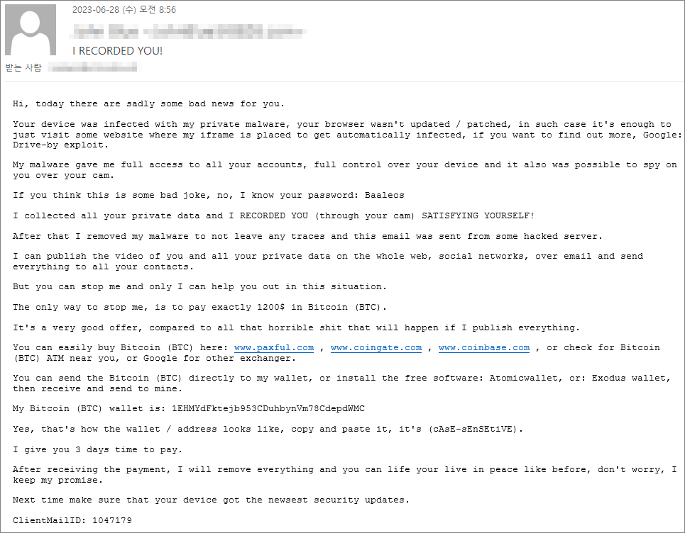 이번주 Pick으로는 지난주에 유입량이 높았던 Hoax 이메일을 선정했습니다. 제목은 'I RECORDED YOU!'라는 문구를 사용하였으며 본문은 개인데이터를 가지고 있다는 협박성 내용을 포함하고 있습니다. Hoax 이메일은 과거에도 여러번 유사한 사례로 공유를 한적이 있으며 꾸준하게 위협이 되고 있습니다. 이번에 확인된 이메일은 영문이나 한글로 번역된 본문을 사용할 수 있으니 이와 유사한 이메일을 확인시 주의가 필요합니다.