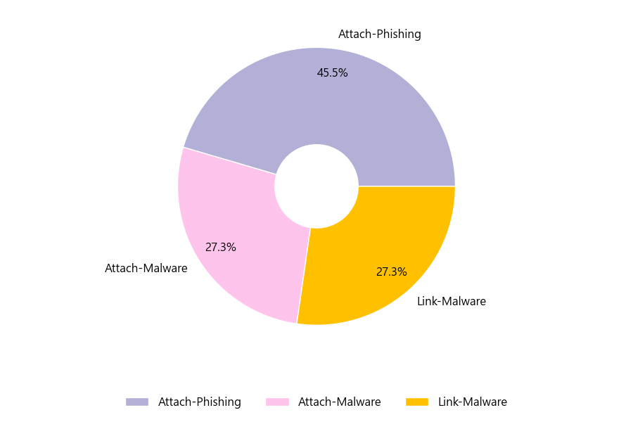 악성 이메일을 유형별로 살펴보면 22건 중 Attach-Phishing형이 45.5%로 가장 많았고 뒤이어 Attach-Malware형이 27.3%를 나타냈습니다.
