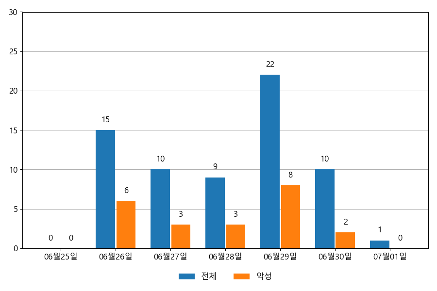 일일 유입량은 하루 최저 1건(악성 2건)에서 최대 22건(악성 8건)으로 일별 편차를 확인할 수 있습니다.