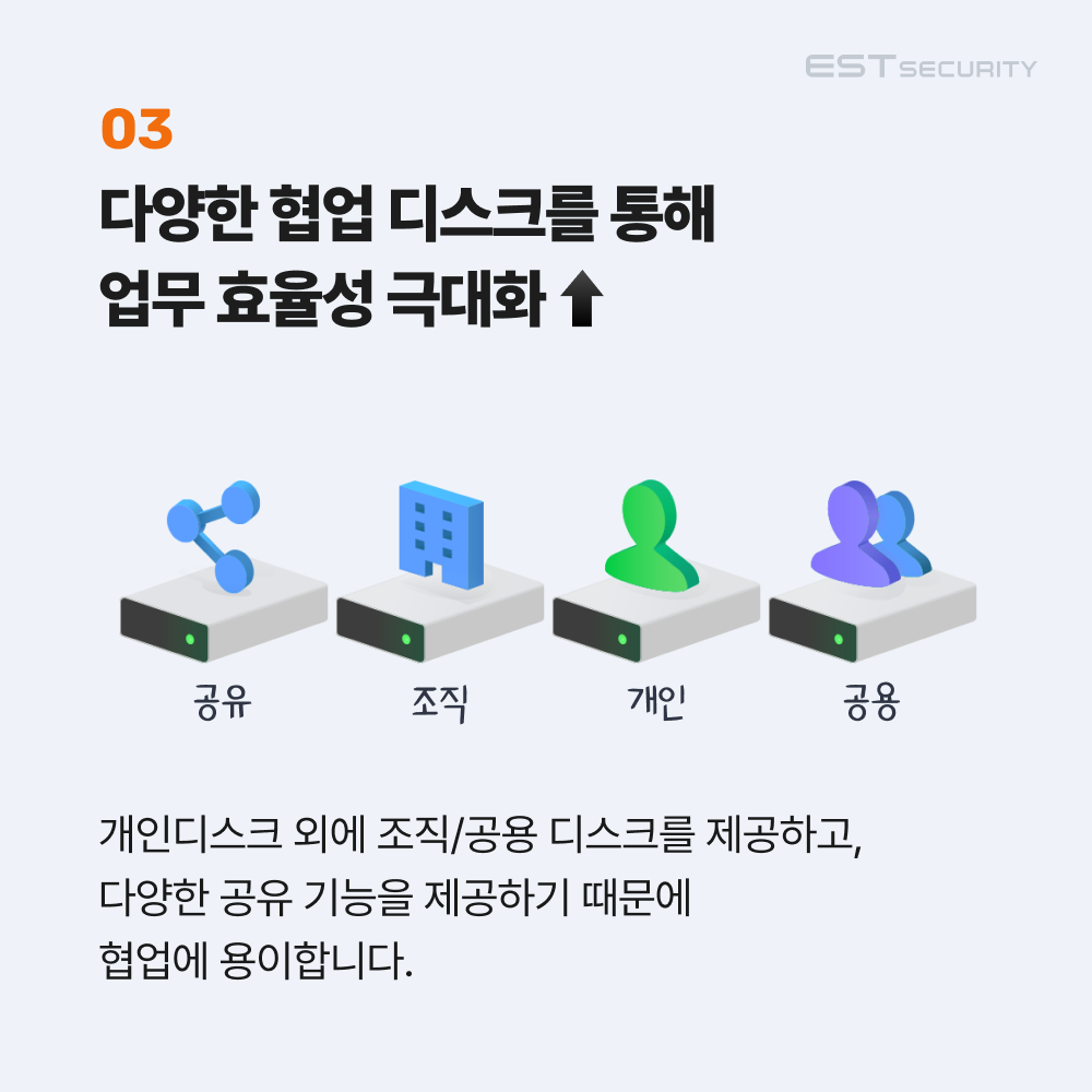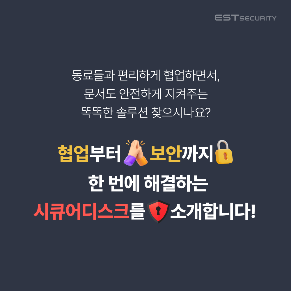 동료들과 편리하게 협업하면서, 문서도 안전하게 지켜주는 똑똑한 솔루션 찾으시나요? 협업부터 보안까지 가능한 이스트시큐리티 문서중앙화 솔루션 시큐어디스크를 사용해보시길 추천드립니다.