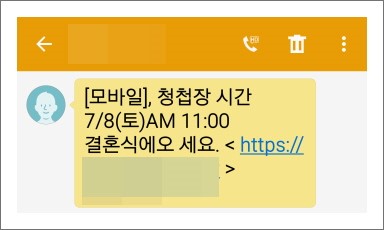이에 청첩장 스미싱 공격도 서서히 증가하고 있는 추세입니다. 청첩장 스미싱을 받은 피해자는 지인의 결혼 소식이라는 판단에 별다른 의심없이 링크를 클릭하게 됩니다.
