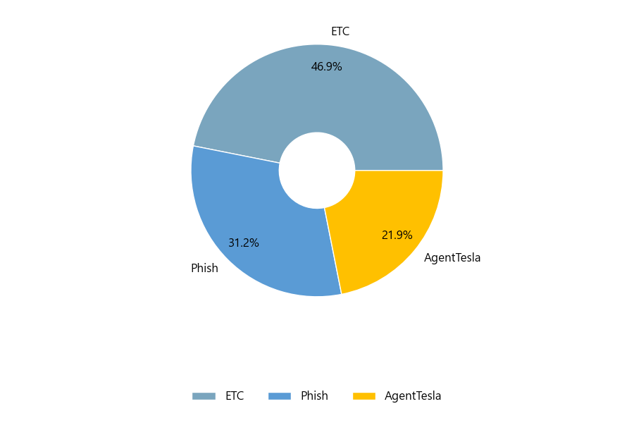 첨부파일은 ‘ETC’형태가 46.9%로 제일 큰 비중을 차지했고 뒤이어 ‘Phish’, ‘AgentTesla’가 각각 31.2%, 21.9%의 비중을 차지했습니다.