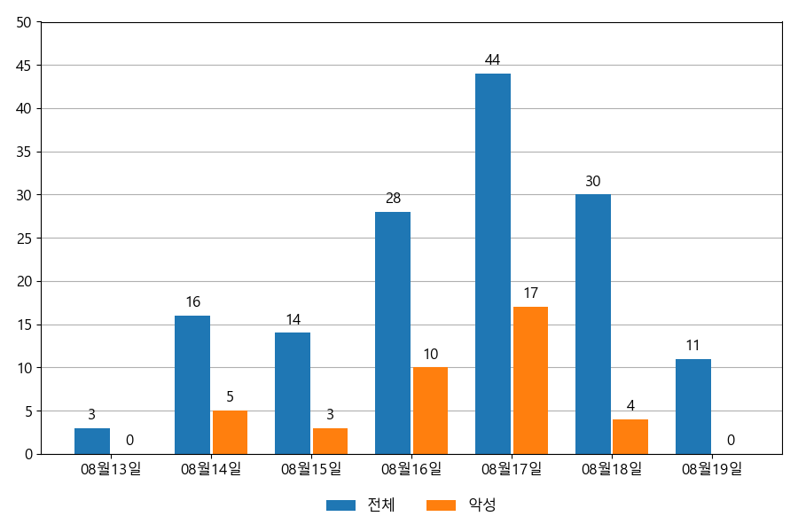일일 유입량은 하루 최저 3건(악성 3건)에서 최대 44건(악성 17건)으로 일별 편차를 확인할 수 있습니다.