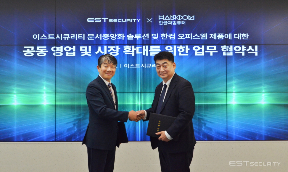 오늘은 보안 전문 기업 이스트시큐리티(대표 정진일)와 한글과컴퓨터(대표 변성준, 김연수, 이하 한컴)는 장소의 제약없이 웹 기반으로 문서를 공동 편집하고 보안은 강화할 수 있는 문서중앙화 솔루션의 개발 및 영업에 관한 전략적 업무협약(MOU)을 체결했다는 소식을 전해드립니다.