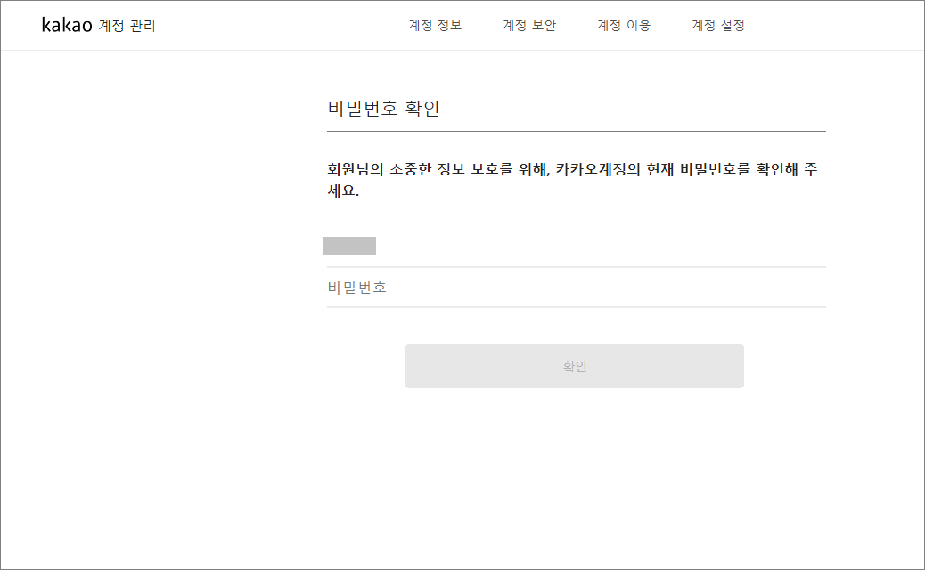 사용자가 [계정도용신고] 혹은 [내 계정이 아님]을 클릭하면, 카카오 로그인 페이지와 유사하게 제작된 피싱 페이지로 접속되며, 비밀번호 입력을 유도하여 계정정보 탈취를 시도합니다.
