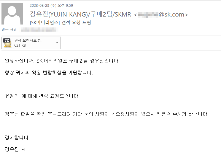 이번주 Pick으로는 국내 기업을 사칭하여 악성코드를 유포 중인 이메일을 선정했습니다. 이번 이메일은 '견적 요청 드림'이라는 제목으로 보내졌으며 첨부파일을 확인하도록 유도하고 있습니다. 압축된 첨부파일의 경우 파일명 '견적 요청자료.exe' 포함되어 있어습니다. 파일실행시 spyware.agenttesla 악성코드가 설치되어 감염PC의 개인정보를 빼돌리기 때문에 주의가 필요합니다. 이와 유사한 정보는 다음 글을 확인하시기 바랍니다.