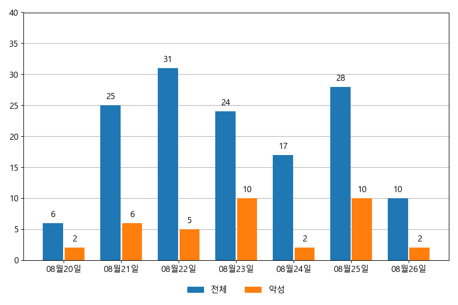 일일 유입량은 하루 최저 6건(악성 2건)에서 최대 31건(악성 10건)으로 일별 편차를 확인할 수 있습니다.