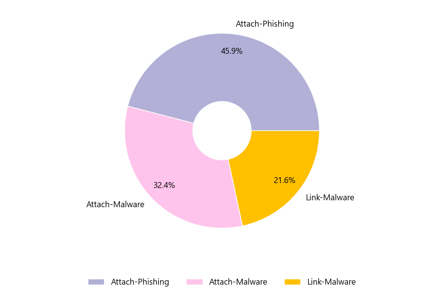 악성 이메일을 유형별로 살펴보면 37건 중 Attach-Phishing형이 45.9%로 가장 많았고 뒤이어 Attach-Malware형이 32.4%를 나타냈습니다.
