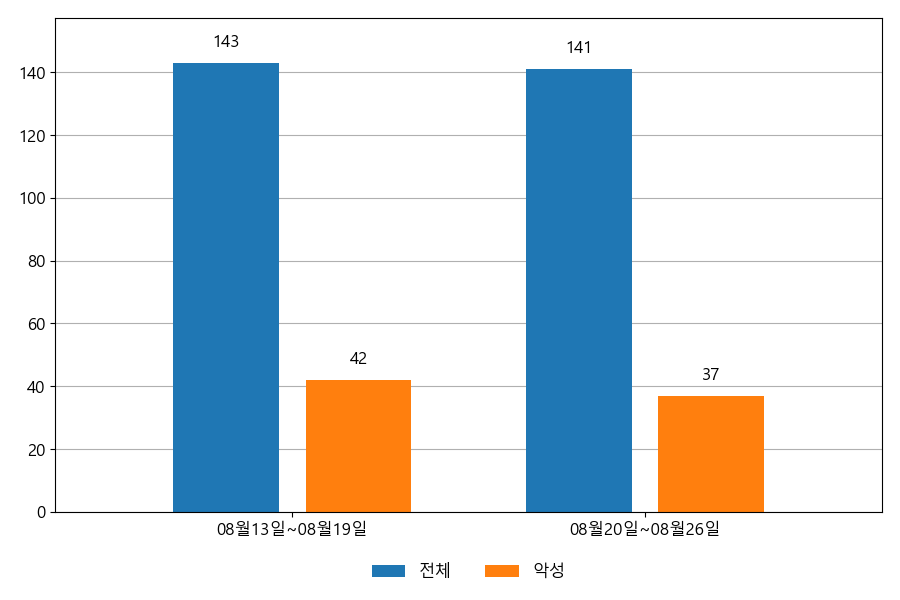 ESRC에서는 자체 운영 중인 이메일 모니터링 시스템의 데이터를 통해 이메일 중심의 공격이 어떻게 이루어지고 있는지 공유하고 있습니다. 다음은 08월 20일~08월 26일까지의 주간 통계 정보입니다.