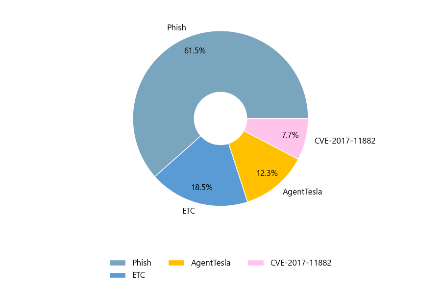 첨부파일은 ‘Phish’형태가 61.5%로 제일 큰 비중을 차지했고 뒤이어 ‘ETC’, ‘AgentTesla’가 각각 18.5%, 12.3%의 비중을 차지했습니다.