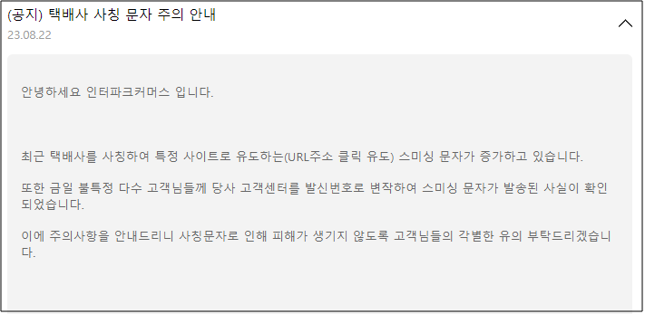 주목할만한 점은, 공격자들이 특정 쇼핑몰의 CS번호로 대량의 택배 스미싱 문자를 발송하였습니다. 이에 쇼핑몰에서는 택배 사징 문자 주의에 대한 공지를 게재하기도 하였습니다.