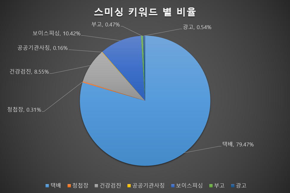 택배 스미싱 공격이 전체 공격의 79.47%를 차지하고 있으며, 보이스피싱, 건강검진, 광고 스미싱 공격이 10.42%, 8.55%, 0.54%로 2,3,4위를 차지하고 있습니다.