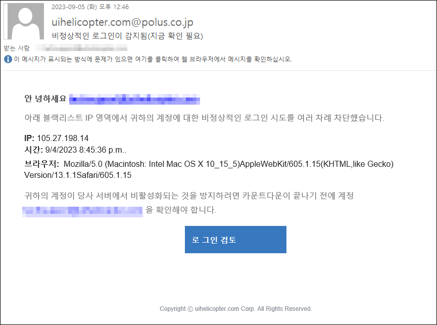 이번주 Pick으로는 비정상 로그인을 했다며 계정 탈취를 목적으로 하는 Phishing 이메일을 선정했습니다. 본문에는 실제 접근을 시도한 듯한 사용자의 IP, 시간, 브라우저 정보등이 포함되어 있고 이메일 계정이 비활성화되지 않기 위해서는 특정 사이트를 통해 검토를 하도록 유도하고 있습니다.