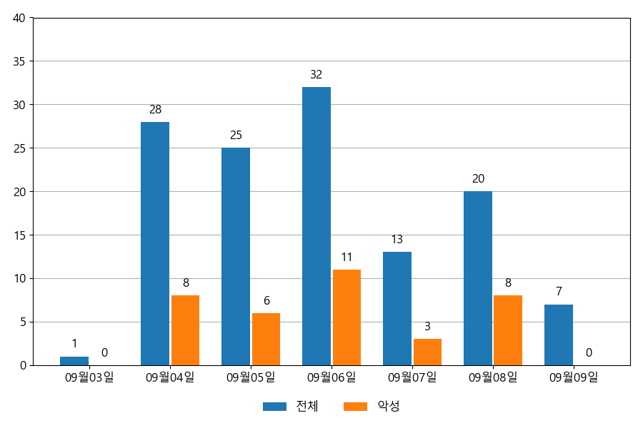 일일 유입량은 하루 최저 1건(악성 3건)에서 최대 32건(악성 11건)으로 일별 편차를 확인할 수 있습니다.