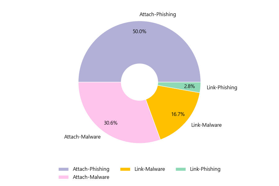 악성 이메일을 유형별로 살펴보면 36건 중 Attach-Phishing형이 50.0%로 가장 많았고 뒤이어 Attach-Malware형이 30.6%를 나타냈습니다.