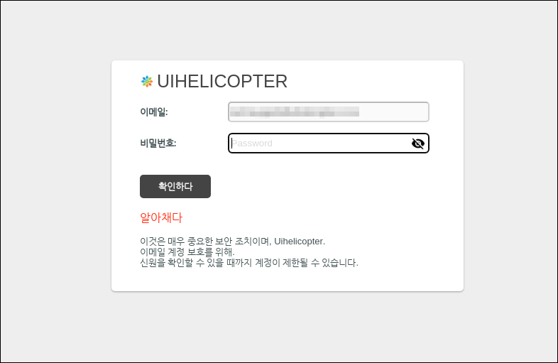 해당 사이트에 접근하면 이메일 비밀번호를 넣는 화면이 나오고 '확인하다' 버튼을 누를시 비밀번호가 탈취되도록 만들어져 있습니다. 이런 방식은 전형적인 피싱 방법이지만 아직도 유효한 방법으로 많이 사용되고 있으므로 이와 유사한 이메일을 확인시 에는 주의를 기울여야 하겠습니다.