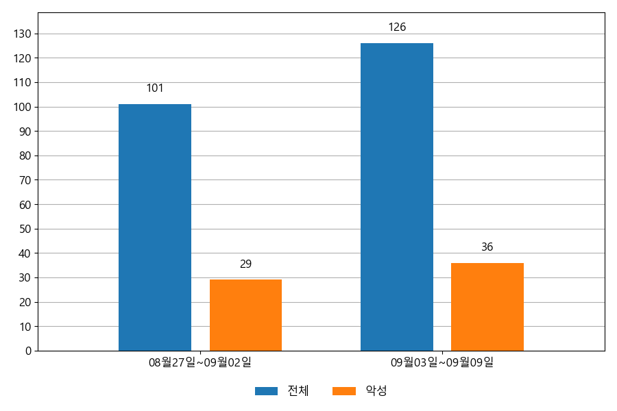 지난주 이메일 유입량은 총 126건이고 그중 악성은 36건으로 28.57%의 비율을 보였습니다. 악성 이메일의 경우 그 전주 29건 대비 36건으로 7건이 증가했습니다.