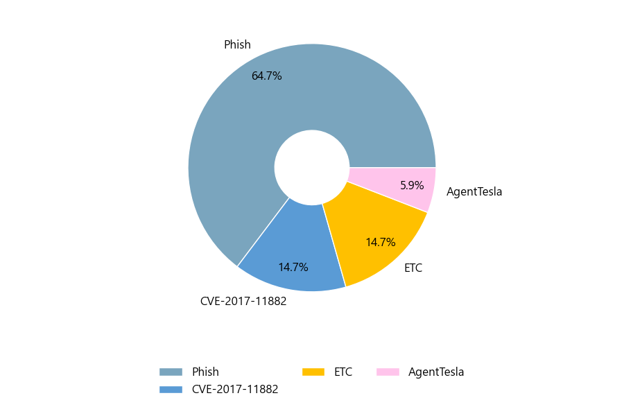 첨부파일은 ‘Phish’형태가 64.7%로 제일 큰 비중을 차지했고 뒤이어 ‘CVE-2017-11882’, ‘ETC’가 각각 14.7%, 14.7%의 비중을 차지했습니다.
