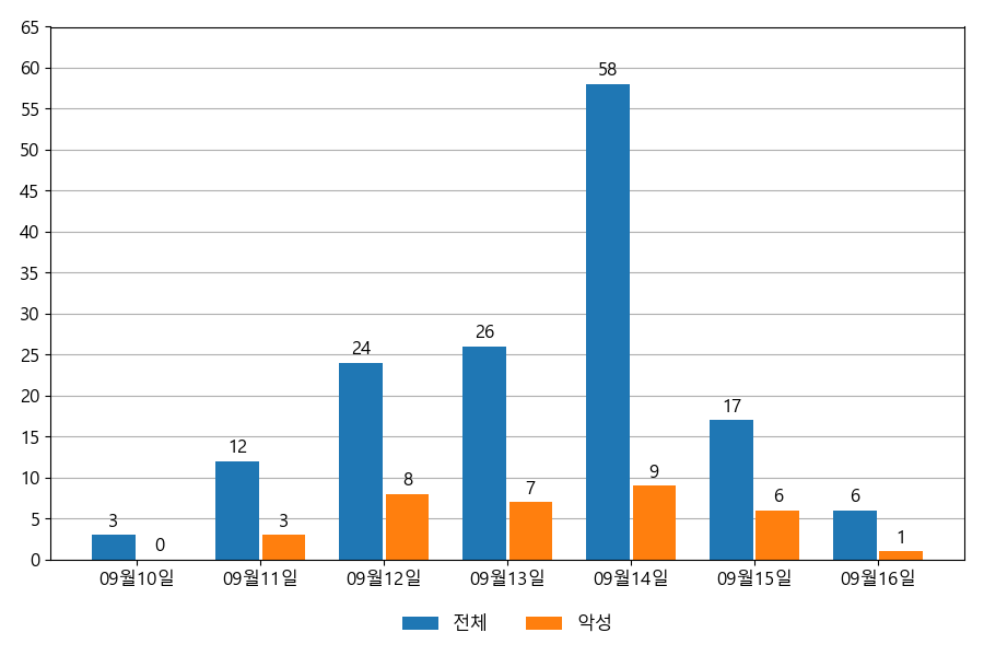 일일 유입량은 하루 최저 3건(악성 1건)에서 최대 58건(악성 9건)으로 일별 편차를 확인할 수 있습니다.