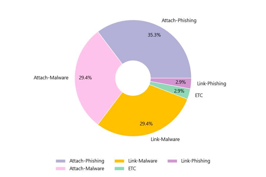 악성 이메일을 유형별로 살펴보면 34건 중 Attach-Phishing형이 35.3%로 가장 많았고 뒤이어 Attach-Malware형이 29.4%를 나타냈습니다.