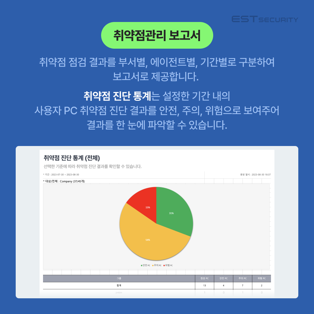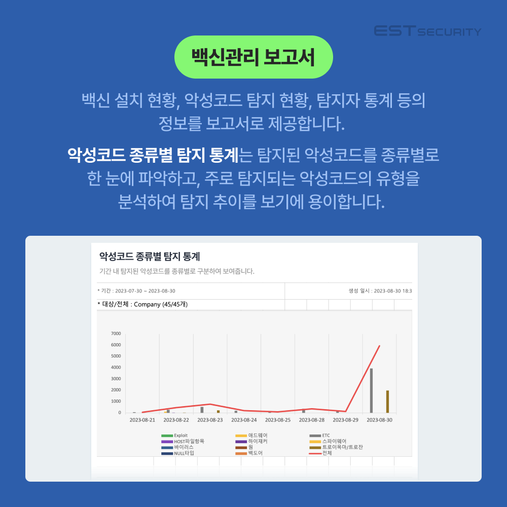 ASM(ALYac Security Manager)은 그래프, 표 등을 사용하여 출력 후 상급자에게 즉시 제출이 가능한 수준의 고품질 보고서 기능을 제공하고 있는데요.