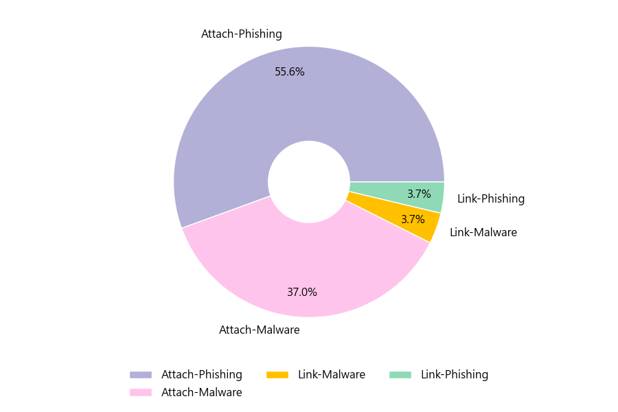 악성 이메일을 유형별로 살펴보면 27건 중 Attach-Phishing형이 55.6%로 가장 많았고 뒤이어 Attach-Malware형이 37.0%를 나타냈습니다.