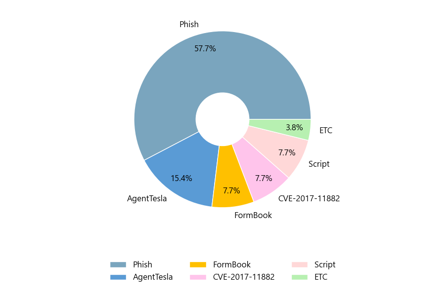 첨부파일은 ‘Phish’형태가 57.7%로 제일 큰 비중을 차지했고 뒤이어 ‘AgentTesla’, ‘FormBook’가 각각 15.4%, 7.7%의 비중을 차지했습니다.