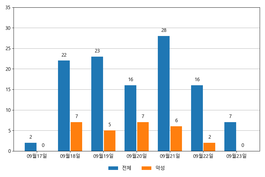 일일 유입량은 하루 최저 2건(악성 2건)에서 최대 28건(악성 7건)으로 일별 편차를 확인할 수 있습니다.