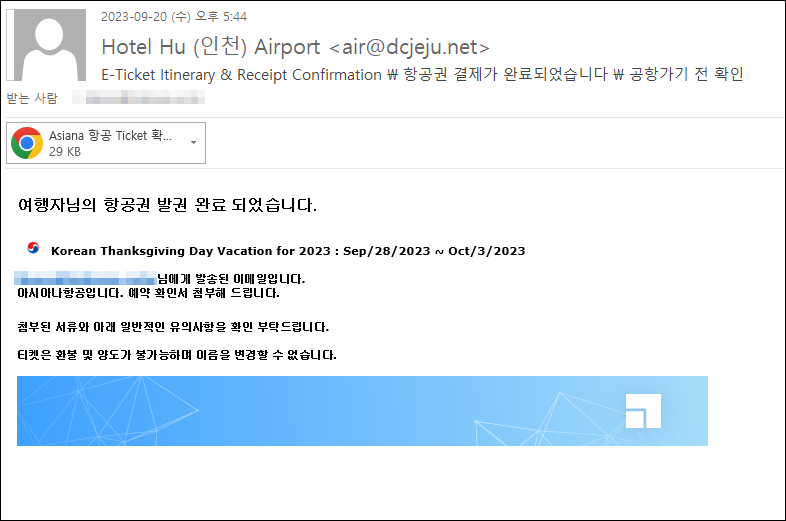 이번주 Pick으로는 여름 휴가 시즌 이후 꾸준히 유포 중인 Phishing 이메일을 선정했습니다. 이번 메일은 "E-Ticket Itinerary & Receipt Confirmation \ 항공권 결제가 완료되었습니다 \ 공항가기 전 확인" 이라는 제목으로 본문은 항공권 발권 완료되었으니 첨부파일을 확인하라는 내용이 포함되어있습니다. 첨부파일을 확인하면 명세서 확인을 위해 로그인을 하도록 유도하는데 이때 개인 이메일과 비밀번호는 외부로 유출되게 됩니다. 최근들어 이와 유사한 'E-Ticket 확인' 형태의 이메일이 많이 확인되고 있으니 주의하시기 바랍니다.