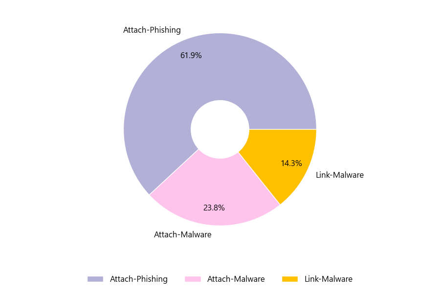 악성 이메일을 유형별로 살펴보면 21건 중 Attach-Phishing형이 61.9%로 가장 많았고 뒤이어 Attach-Malware형이 23.8%를 나타냈습니다.