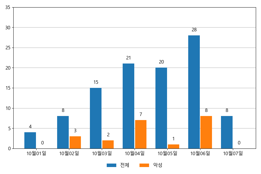 일일 유입량은 하루 최저 4건(악성 1건)에서 최대 28건(악성 8건)으로 일별 편차를 확인할 수 있습니다.