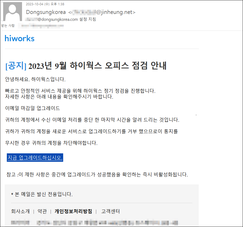 이번주 Pick으로는 하이웍스 사칭 Phishing 이메일을 선정했습니다. 이번 이메일은 메일서비스의 정기 정검을 이유로 업그레이드를 반드시 해야한다는 내용을 포함하고 있습니다. 본문의 "지금 업그레이드하십시오." 링크를 클릭할 경우 하이웍스와는 관련없은 피싱 사이트로 접근하게 되며 이메일과 이메일 암호를 가로채기 위해 로그인을 유도합니다. 연관 이메일 정보는 다음 글을 통해 소개하오니 참고 하시기 바랍니다.