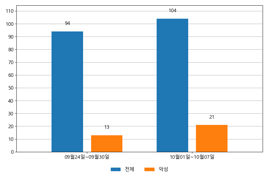 지난주 이메일 유입량은 총 104건이고 그중 악성은 21건으로 20.19%의 비율을 보였습니다. 악성 이메일의 경우 그 전주 13건 대비 21건으로 8건이 증가했습니다.