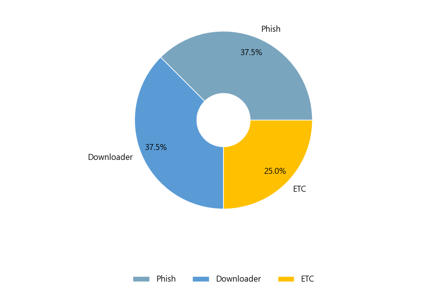 첨부파일은 ‘Phish’형태가 37.5%로 제일 큰 비중을 차지했고 뒤이어 ‘Downloader’, ‘ETC’가 각각 37.5%, 25.0%의 비중을 차지했습니다.