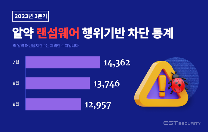 2023년 3분기 자사 백신 프로그램 ‘알약’에 탑재되어 있는 ‘랜섬웨어 행위기반 사전 차단’기능을 통해 총 41,065건의 랜섬웨어 공격을 차단했으며, 이를 일간 기준으로 환산하면 일 평균 446건의 랜섬웨어 공격이 차단된 것으로 볼 수 있습니다.