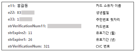 카드번호, 유효기간 및 cvc번호가 유출되면 금전적 손해가 발생할 수 있기 때문에 신용카드 정보와 같은 금융정보 입력 시에는 반드시 주의가 필요합니다.
