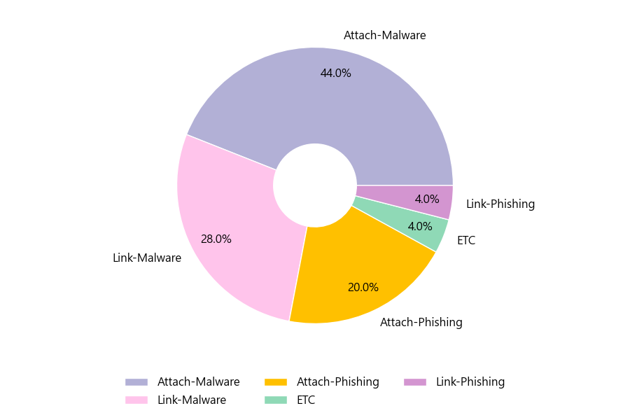 악성 이메일을 유형별로 살펴보면 25건 중 Attach-Malware형이 44.0%로 가장 많았고 뒤이어 Link-Malware형이 28.0%를 나타냈습니다.