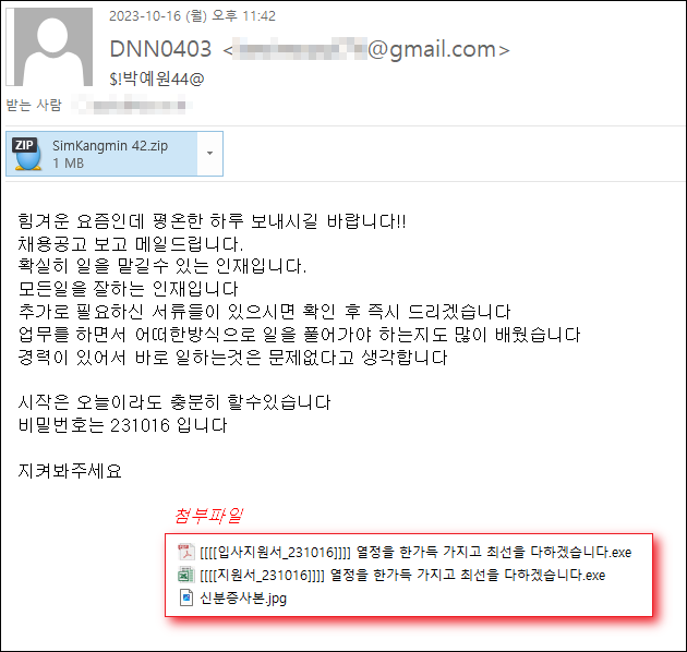 이번주 Pick으로는 몇년간 꾸준히 유포 중인 입사지원서 사칭 이메일을 선정했습니다. 본문 내용은 기존과 유사하게 이력서 첨부파일을 유도하고 있으며 첨부파일 탐지를 막기위해 비밀번호를 설정하였습니다. 첨부파일을 압축 해제하면 악성 파일이 존재하며 클릭시 랜섬웨어가 실행됩니다. 이런 형태의 이메일은 다년간 조금식 업데이트되며 유포가 지속적으로 확인되고 있으니 유사한 이메일을 받는다면 주의를 기울여야겠습니다. 관련 내용은 다음 글을 확인하시기 바랍니다.
