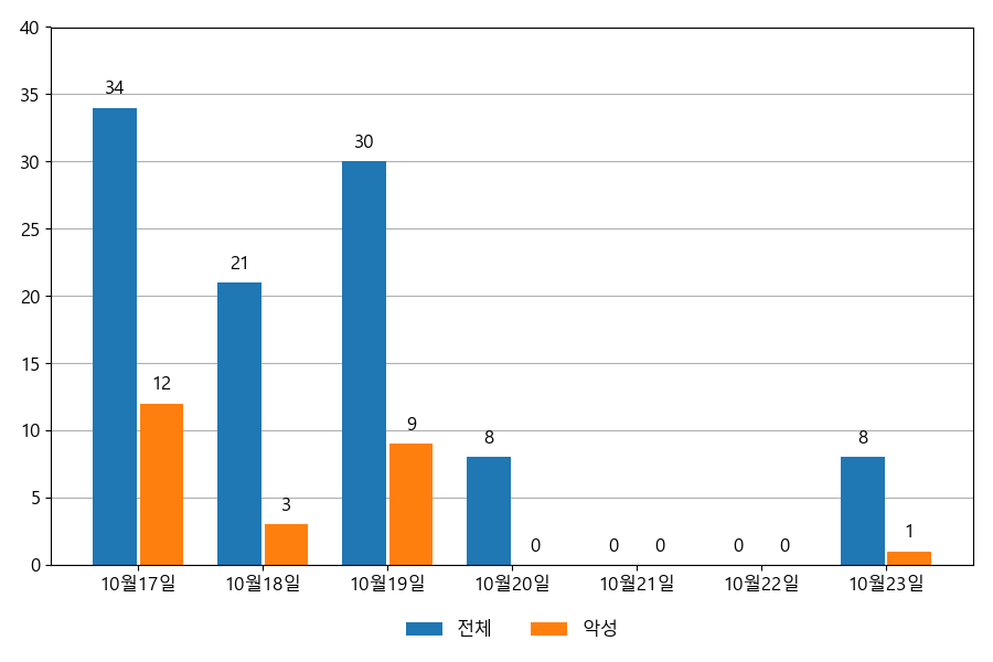 일일 유입량은 하루 최저 8건(악성 1건)에서 최대 34건(악성 12건)으로 일별 편차를 확인할 수 있습니다.