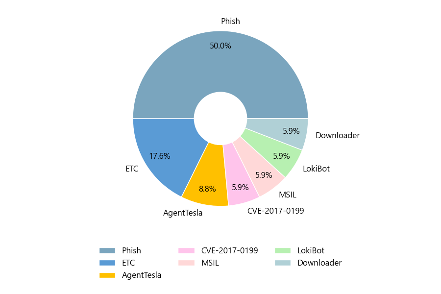 첨부파일은 ‘Phish’형태가 50.0%로 제일 큰 비중을 차지했고 뒤이어 ‘ETC’, ‘AgentTesla’가 각각 17.6%, 8.8%의 비중을 차지했습니다.